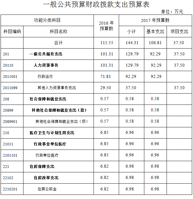 2017年一般公共預算財政撥款收入144.31萬元,一般公共預算財政撥款支出144.31萬元,比2016年增加27.76萬元。其中:基本支出106.81萬元,比2016年增加20.76萬元,主要原因是實施工資制度改革后,人員經費增加,同時公用經費調標等,主要用于保障在職人員工資福利及社會保險繳費,離退休人員離退休費及生活補助,保障部門正常運轉的各項商品服務支出;項目支出37.50萬元,比2016年增加7.0萬元,主要原因是承擔行政職能事業單位改革試點工作,主要用于行政審批制度改革、事業單位改革、黨政機關網站開辦審核及管理、政務和公益機構域名注冊等重點工作。