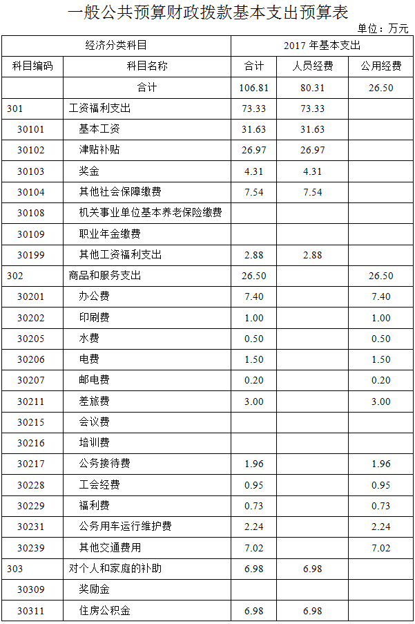 1. 2017年一般公共預算財政撥款運行經費26.50萬元,主要用于:辦公費及印刷費、水費、電費、郵電費、差旅費、公務接待費、公務用車運行維護費等。