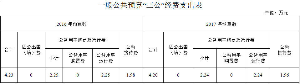 2017年“三公”經費預算4.20萬元,比2016年減少0.03萬元。其中:公務接待費1.96萬元,比2016年減少0.02萬元;公務用車運行維護費2.24萬元,比2016年減少0.01萬元;主要原因是嚴格管理,控制開支。