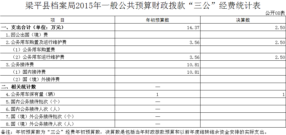 2015年梁平縣檔案局“三公”經(jīng)費決算數(shù)為2.50萬元,比上年決算數(shù)減少15.26萬元,主要原因是出國出境費減少,接待費用減少。比年初預(yù)算數(shù)減少1.15萬元,主要原因是接待批次減少。