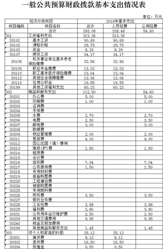 1、機關運行經費安排情況。2018年一般公共預算財政撥款運行經費453.06萬元,主要用于辦公費5萬元,印刷費1萬元,水費2.7萬元,電費2.5萬元,郵電費3萬元,物業管理費2萬元,差旅費4萬元,維修費1.5萬元,培訓費6.32萬元,公務接待費1.5萬元,工會費3.88萬元,福利費3.8萬元,公務用車運行維護費2.5萬元,其他交通費9.95萬元,其他商品和服務支出1.45萬元。
