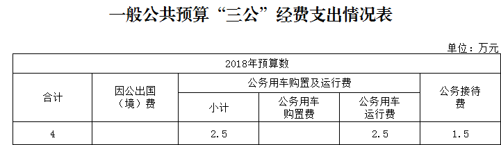 (五)“三公”經費:指用一般公共預算財政撥款安排的因公出國(境)費、公務用車購置及運行維護費、公務接待費。其中,因公出國(境)費反映單位公務出國(境)的國際旅費、國外城市間交通費、住宿費、伙食費、培訓費、公雜費等支出;公務用車購置費反映單位公務用車購置支出(含車輛購置稅);公務用車運行維護費反映單位按規定保留的公務用車燃料費、維修費、過路過橋費、保險費、安全獎勵費用等支出;公務接待費反映單位按規定開支的各類公務接待(含外賓接待)支出。