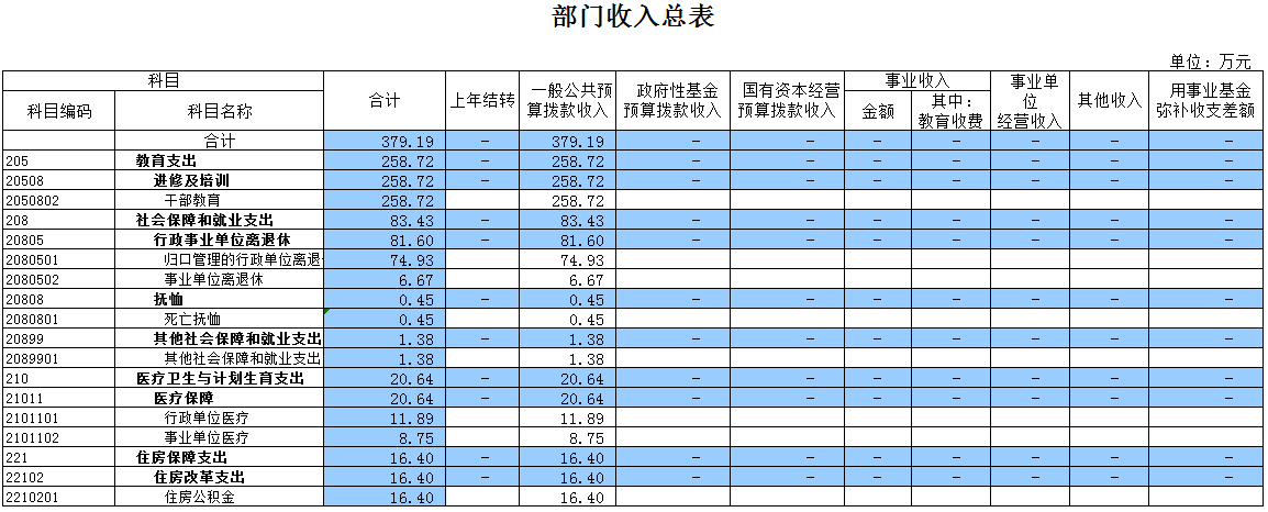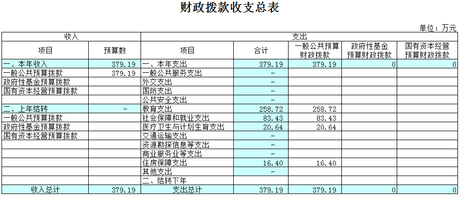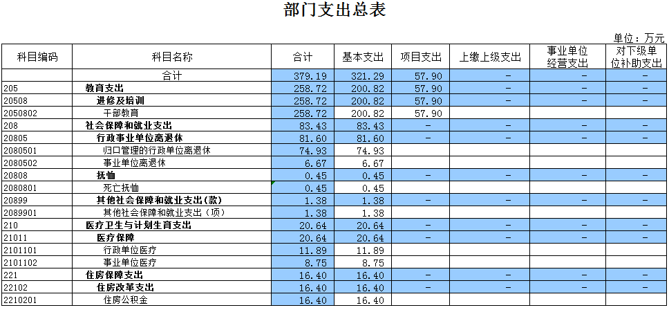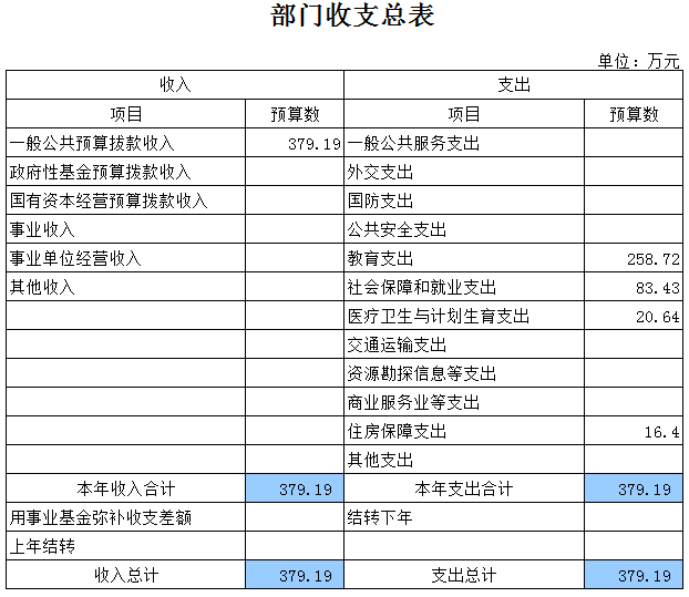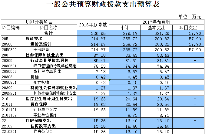 2017年本單位年初預算收入合計379.19萬元。其中,年初預算財政撥款379.19萬元(一般公共預算財政撥款379.19萬元),可支配收入總計379.19萬元。本年支出合計379.19萬元, 按功能分類:干部教育撥款支出258.72萬元;社會保障和就業支出83.43萬元;醫療衛生與計劃生育支出20.64萬元;住房保障支出16.40萬元。本年公共預算基本支出321.29萬元,按經濟分類:工資福利支出172.78萬元,商品和服務支出50.06萬元,對個人和家庭補助支出98.45萬元。本年財政預算撥款項目支出57.9萬元,主要用于培訓費??傤A算收支與2016年相比,主要變化是財政預算撥款增加42.23萬元,其原因:一是2016年期間在職人員工資調標和離退休人員增加離退休費,未納入2016年預算。二是2017年人頭包干辦公經費提高了,參公人員標準1.7萬元/年.人,事業人員標準1.5萬元/年.人。三是2016年增加項目公務車補貼、平時考核獎納入2017年預算。