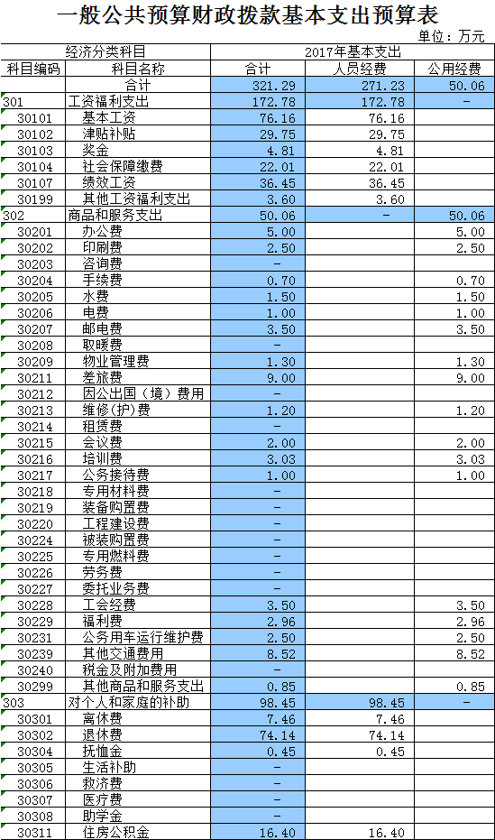 1、2017年一般公共預算財政撥款運行經費 379.19萬元,主要用于辦公費5萬元,印刷費2.5萬元,手續費0.7萬元,水費1.5萬元,電費1萬元,郵電費3.5萬元,物業管理費1.3萬元,差旅費9萬元,維修費1.2萬元,會議費2萬元,培訓費3.03萬元,公務接待費1萬元,工會費3.5萬元,福利費2.96萬元,公務用車運行維護費2.5萬元,其他交通費8.52萬元,其他商品和服務支出0.85萬元。