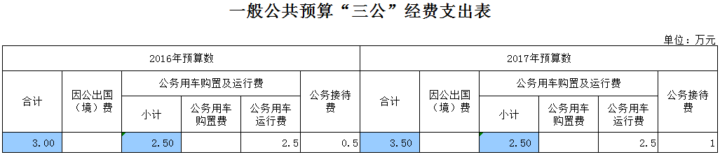 我單位嚴格落實中央八項規定、《黨政機關厲行節約反對浪費條例》和市、區關于厲行節約的各項規定,繼續從嚴從緊控制“三公”經費支出,2017年“三公”經費預算為3.5萬元,其中:公務接待費1萬元,公務用車運行維護費2.5萬元。比2016年“三公”經費預算增加0.5萬元。