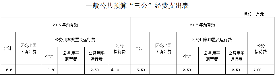 我單位嚴格落實中央八項規定、《黨政機關厲行節約反對浪費條例》和市、縣關于厲行節約的各項規定,繼續從嚴從緊控制“三公”經費支出,2017年“三公”經費預算為6.5萬元,其中:因公出國(境)費用0萬元,公務接待費4.0萬元,公務用車運行維護費2.5萬元。比2016年“三公”經費預算減少0.1萬元。