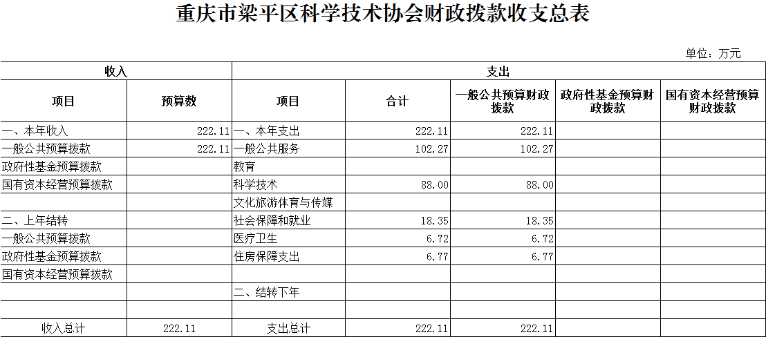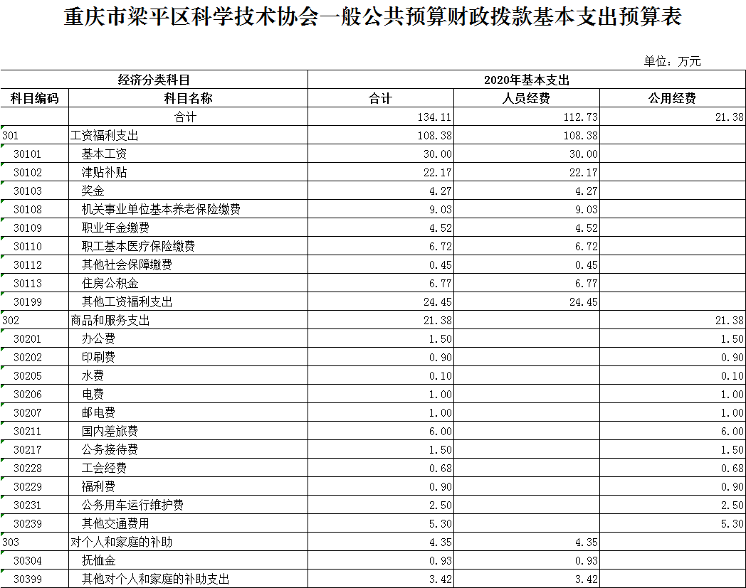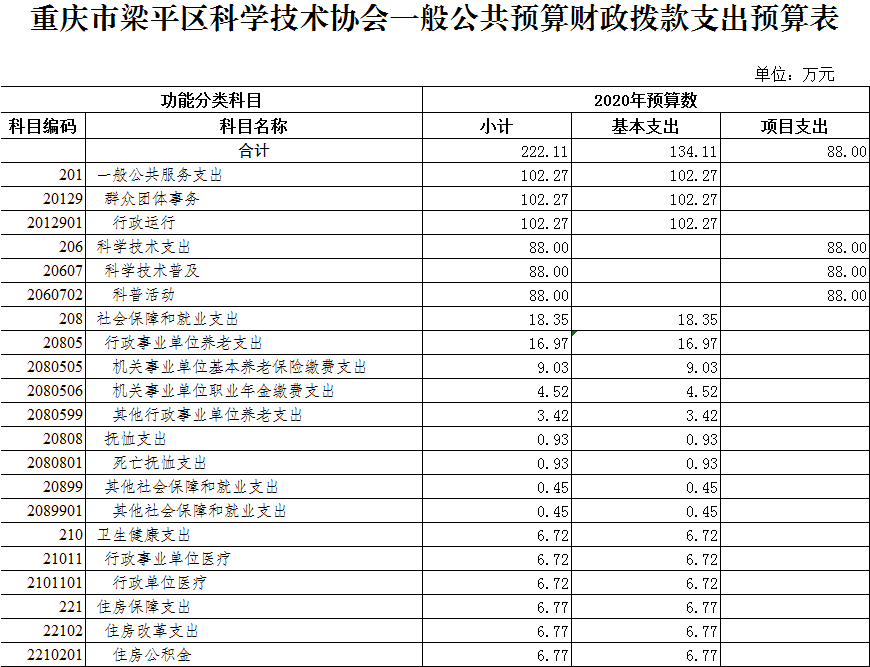 2020年一般公共預(yù)算財(cái)政撥款收入222.11萬元,一般公共預(yù)算財(cái)政撥款支出222.11萬元,比2019年增加25.22萬元。其中:基本支出134.11萬元,比2019年增加25.22萬元,主要原因是人員變動(dòng)等,主要用于保障本單位在職人員工資福利及社會(huì)保險(xiǎn)繳費(fèi),退休人員補(bǔ)助等,保障部門正常運(yùn)轉(zhuǎn)的各項(xiàng)商品服務(wù)支出;項(xiàng)目支出88萬元,比2019年增加0萬元,主要用于院士專家工作站建設(shè)、科學(xué)技術(shù)普及、青少年科技活動(dòng)、創(chuàng)新驅(qū)動(dòng)助力工程建設(shè)、企業(yè)數(shù)據(jù)信息推送、基層科普行動(dòng)計(jì)劃項(xiàng)目?jī)?chǔ)備建設(shè)、梁平科技館建設(shè)等。