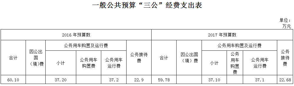 2017年“三公”經費預算59.78萬元,比2016年減少0.32萬元。其中:公務用車運行維護費37.10萬元,2016年減少0.1萬元;公務接待費22.68萬元,比2016年減少0.22萬元;主要原因:一是車改過后,單位保留車輛減少,運行成本相應減少;二是我局將進一步嚴格按照中央八項規定、《黨政機關厲行節約反對浪費條例》和市、區關于厲行節約的各項規定,嚴格遵守各項財務制度,嚴禁鋪張浪費,重點控制好會議費、公務接待費等支出,努力壓縮運行成本,提高財政資金使用效益。