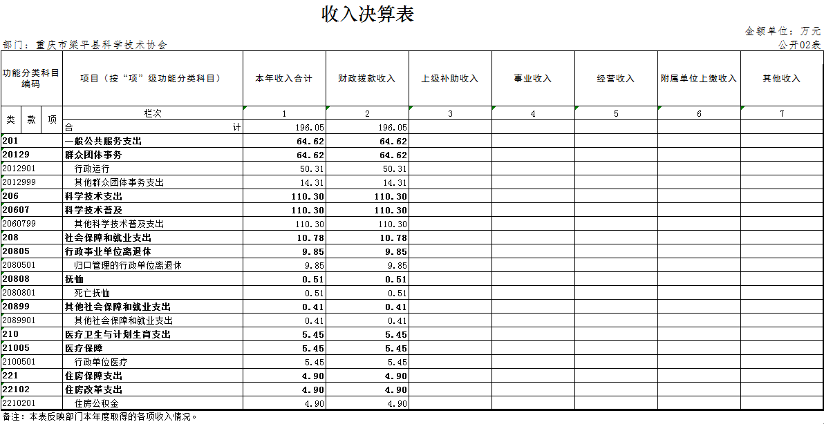 本部門2016年度收入總計196.05萬元,支出總計196.05萬元。與2015年決算數相比,收支增加23.96萬元、增長13.92%,主要原因是因群團改革,增加科普經費。