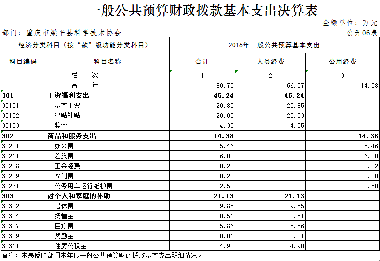(九)基本支出:指為保障機構正常運轉、完成日常工作任務而發生的人員經費和公用經費。其中:人員經費指政府收支分類經濟科目中的“工資福利支出”和“對個人和家庭的補助”;公用經費指政府收支分類經濟科目中除“工資福利支出”和“對個人和家庭的補助”外的其他支出。