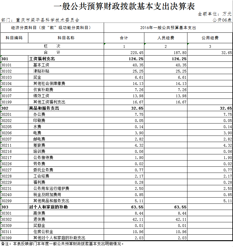 本部門2016年度一般公共財政撥款基本支出220.45萬元。其中:人員經費187.80萬元,較上年減少5.62萬元,主要原因是人員減少。人員經費用途主要包括基本工資、津貼補貼、獎金、社會保障繳費、伙食補助費、績效工資等。公用經費32.65萬元,較上年增加10.57萬元,主要原因是物價上漲導致行政運行成本有所增長,公用經費用途主要包括辦公費、水電費、郵電費、差旅費、公車運行費等。