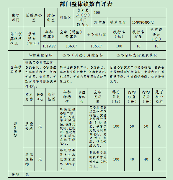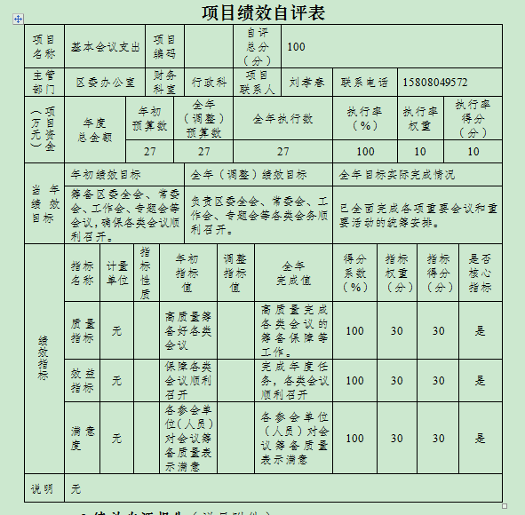 根據預算績效管理要求,本部門對7個項目開展了績效自評,其中,以填報目標自評表和自評報告的形式開展自評7項,涉及資金467.72萬元。從評價情況來看,本部門項目資金使用整體均能按計劃、按要求使用,并能夠達到預期目標,確保了區委各項重點工作有序推進、重要會議精神得到貫徹落實,保障了黨政通訊暢通,信息傳遞及時。