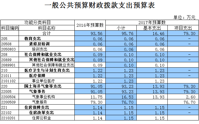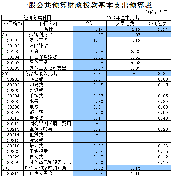 2017年一般公共預算財政撥款收入95.76 萬元,比2016年增加2.2 萬元。其中:基本支出 16.46萬元,比2016年增加2.2萬元,;項目支出 79.3萬元,與2016年相同。