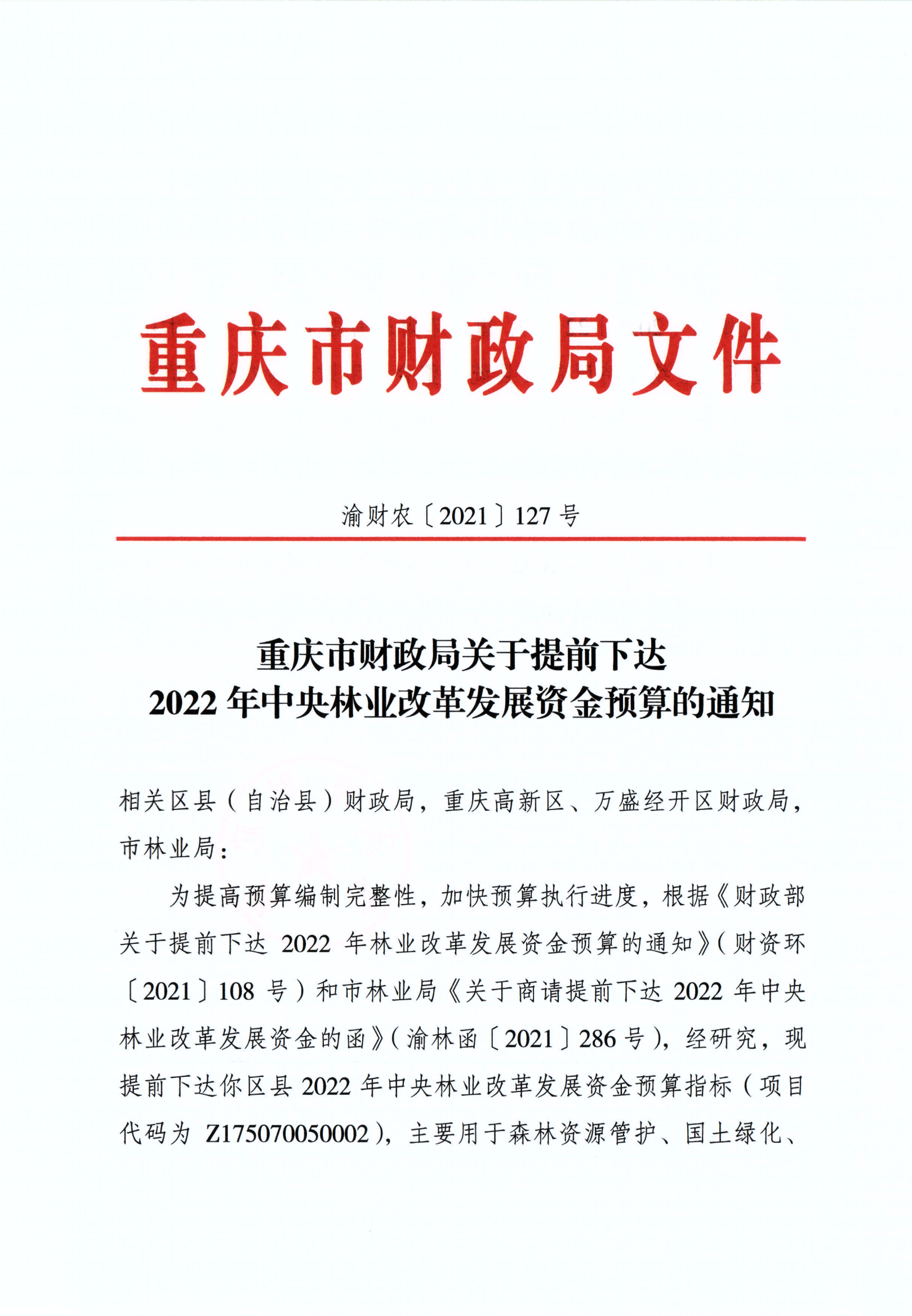 重慶市財政局關于提前下達2022年中央林業改革發展資金預算的通知