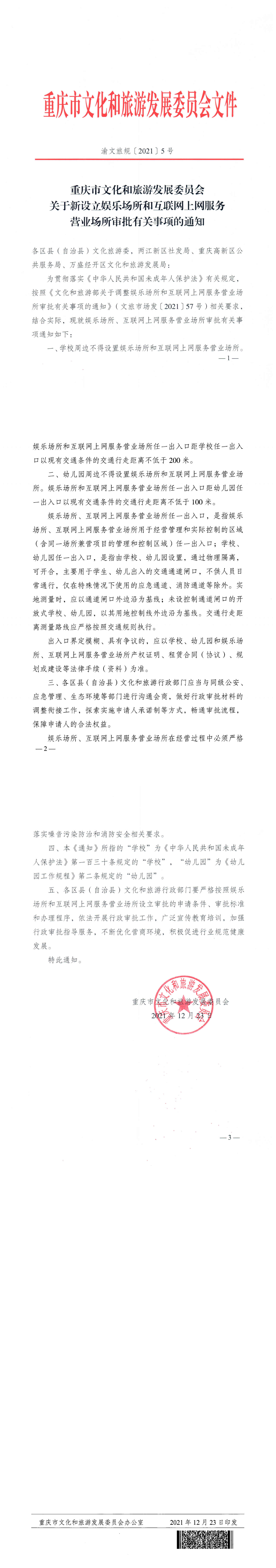 | 標題 | 重慶市文化和旅游發展委員會關于新設立娛樂場所和互聯網上網服務營業場所審批有關事項的通知 | ||