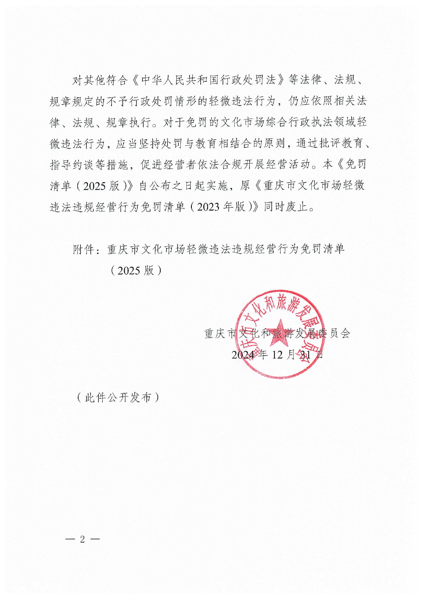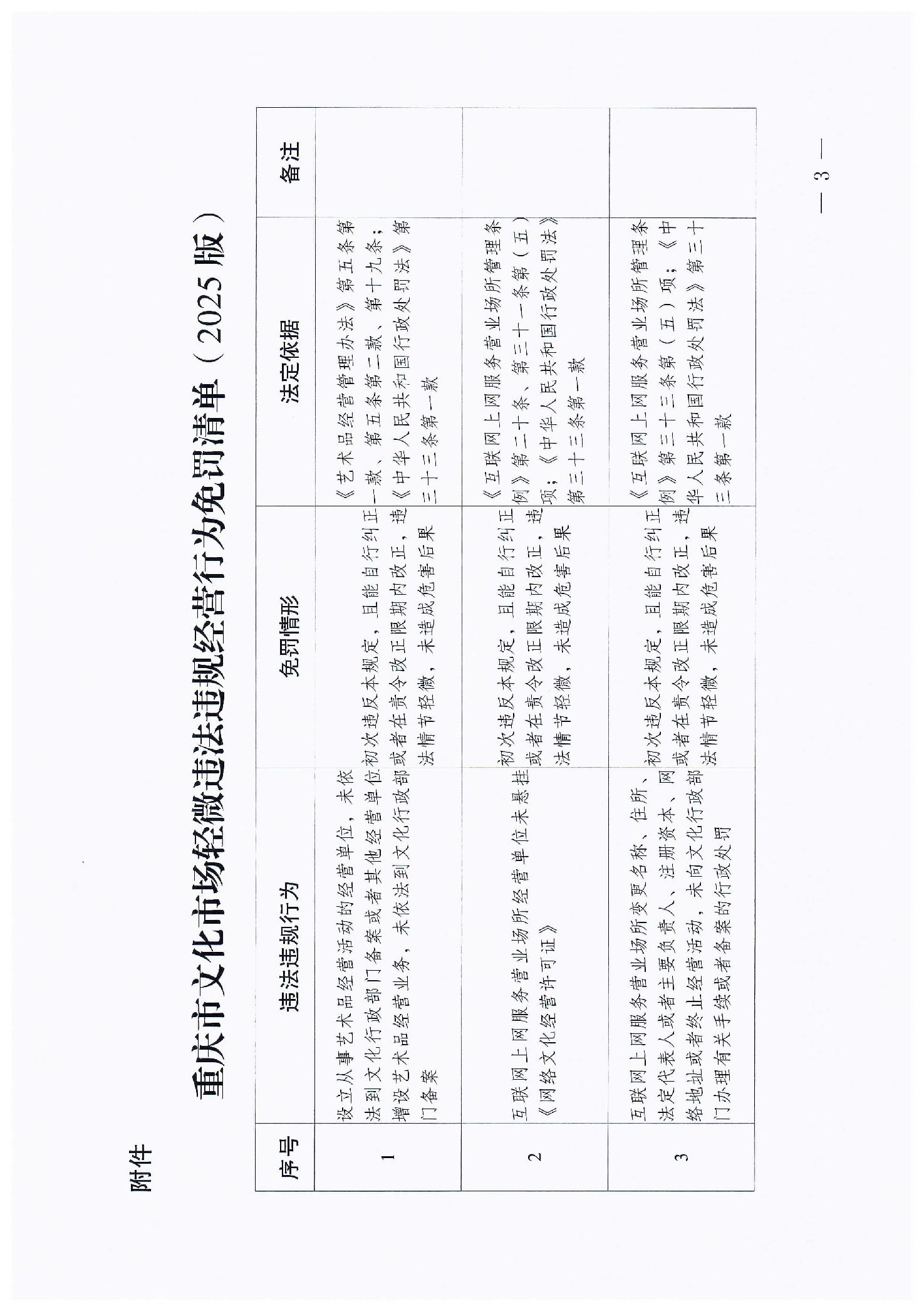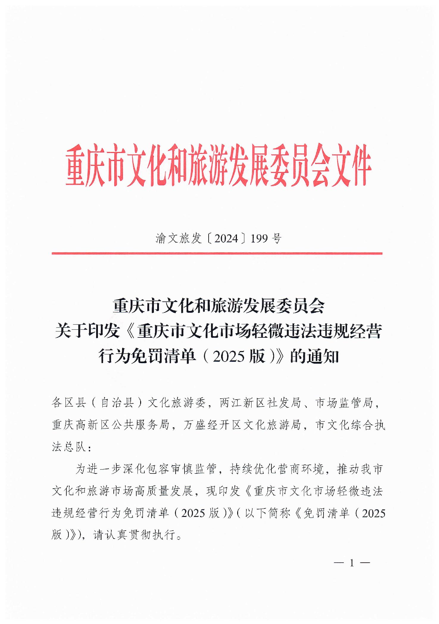 | 標題 | 重慶市文化和旅游發(fā)展委員會關(guān)于印發(fā)《重慶市文化市場輕微違法違規(guī)經(jīng)營行為免罰清單(2025版)》的通知 |