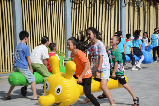 學(xué)生志愿者和鄉(xiāng)村兒童一起參加趣味游戲活動(dòng)。(劉文靜 攝)