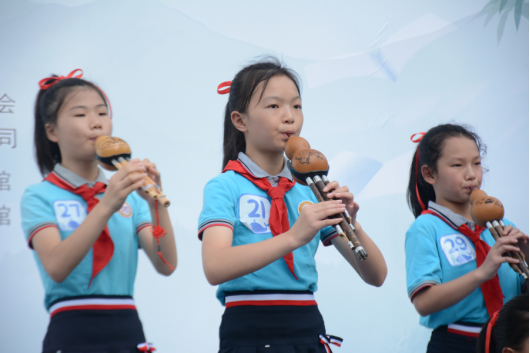 梁平區(qū)城西小學(xué)的學(xué)生志愿者進(jìn)行葫蘆絲演奏。(劉文靜 攝)