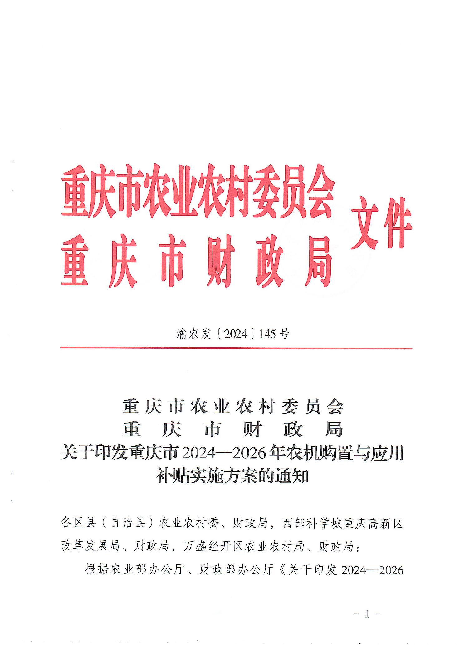 標題 重慶市2024-2026年農機購置與應用補貼實施方案
