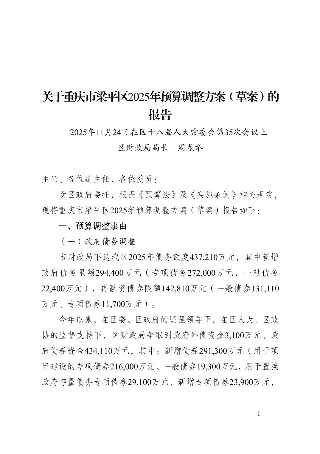 | 標題 | 關于重慶市梁平區2025年預算調整方案(草案)的報告(2025年11月24日) |
