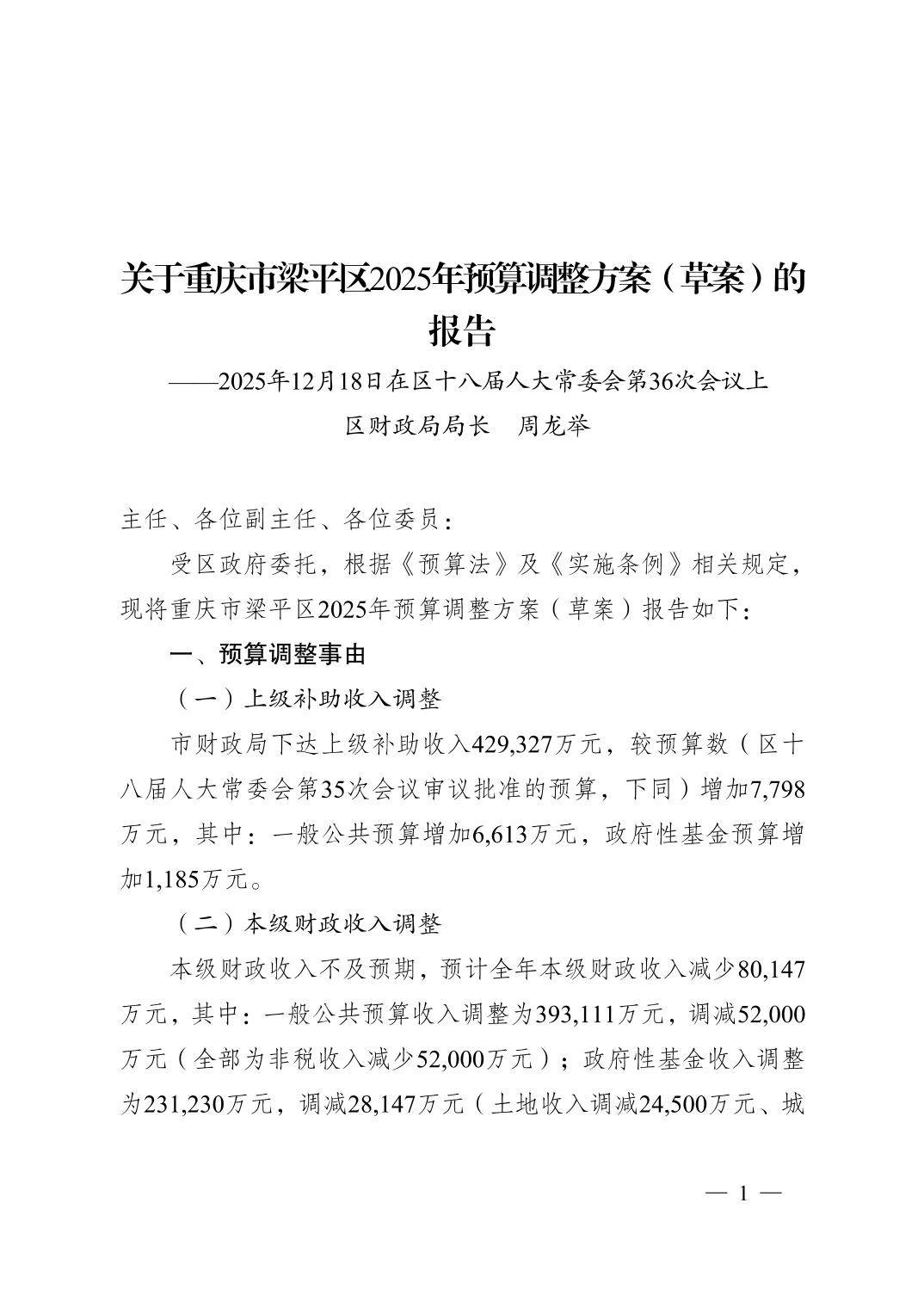 | 標題 | 關于重慶市梁平區2025年預算調整方案(草案)的報告(2025年12月18日) |