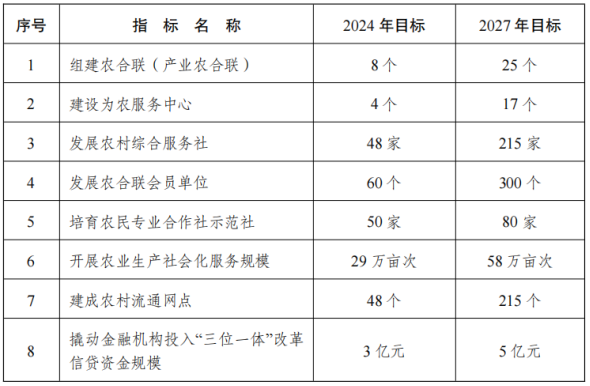 2024年,區(qū)內(nèi)新型為農(nóng)服務(wù)體系基本形成、為農(nóng)服務(wù)能力顯著提升,到2027年,全區(qū)農(nóng)業(yè)產(chǎn)業(yè)服務(wù)高質(zhì)高效、農(nóng)村流通服務(wù)全面覆蓋、農(nóng)村金融服務(wù)方便快捷、農(nóng)民群眾可感可及的新型為農(nóng)服務(wù)體系全面建成。