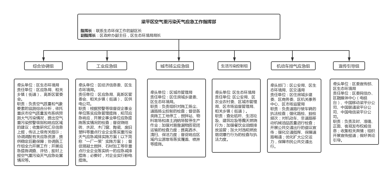 根據工作需要,在重慶市空氣重污染天氣應急工作指揮部(以下簡稱市指揮部)和區政府統一領導下,成立梁平區空氣重污染天氣應急工作指揮部(以下簡稱區指揮部)。區指揮部實行指揮長負責制,由區政府分管生態環境工作的領導擔任指揮長,區政府辦公室聯系生態環境的副主任、區生態環境局局長任副指揮長,統一領導和組織梁平區空氣重污染天氣應對工作,并按市指揮部指令做好渝東北區域空氣重污染天氣應對工作,貫徹落實國家、市空氣重污染天氣應急要求,及時研究處理空氣重污染天氣重大事項,落實區域聯防聯控和應急響應措施,定期組織開展空氣重污染天氣應急演練。